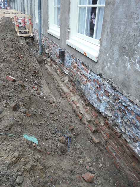 Utrecht - Lepelenburg 9 (oud adres) (nu Bruntenhof 5) geheel rechts tijdens werkzaamheden aan de fundering. Op de achtergrond Lepelenburg 10 (oud adres) (nu Bruntenhof 10)
