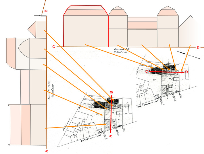 Detail: de panden, gezien vanaf twee doorsneden over het slop, bewerking door UDS, jp-1019