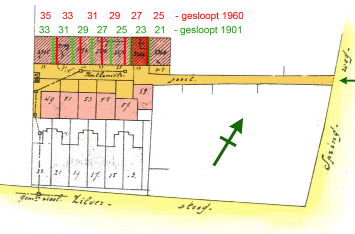 Het te slopen pand Springweg 23 (oud adres) is donkerder rood gekleurd