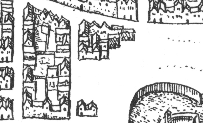 Omschrijving: ''Trajectum', plattegrond met het oosten boven. Detail met de noordoosthoek van het Vredenburg.