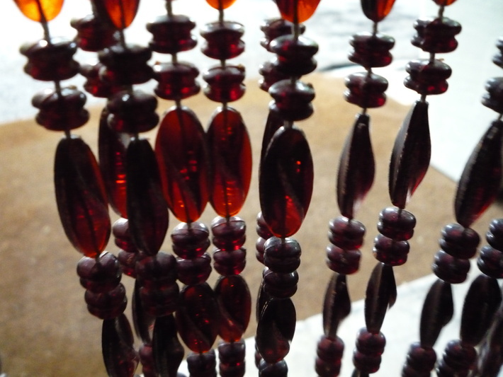 Parelsnoer (van plastic) als vliegengordijn in de ingang van een bar in Pavia (I). Dit is het motief van de parellijst en de astragaal