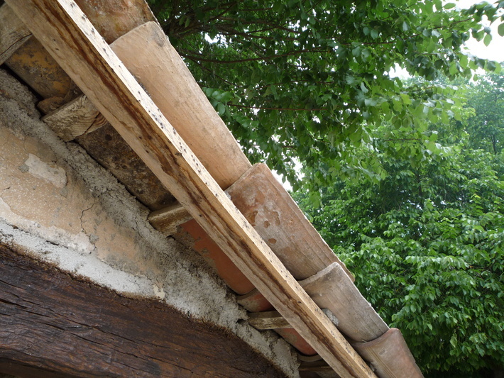 , bijgebouw. Dakrand met holle en bolle pannen.
