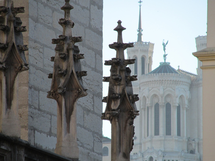 Lyon (F) - église Saint-Nizier, pinakels aan de noordzijde, met op de achtergrond de hoog gelegen basilique de Notre-Dame de Fourvière