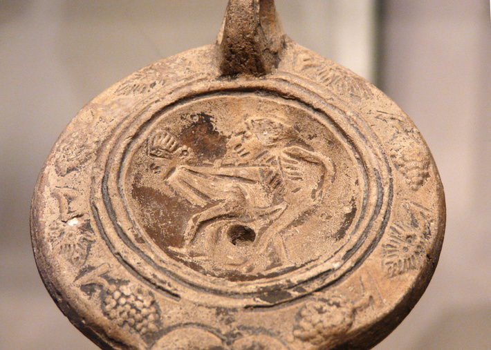 opmerkingen : Tunis (Tunesië) - Musée national du Bardo, inv.nr K 971, tt 277. Olielampje (detail) met erotische scène, vermoedelijk afkomstig uit een bordeel nabij een militair hoofdkwartier. Uit Haidra, aardewerk, 2e-3e eeuw na Chr.