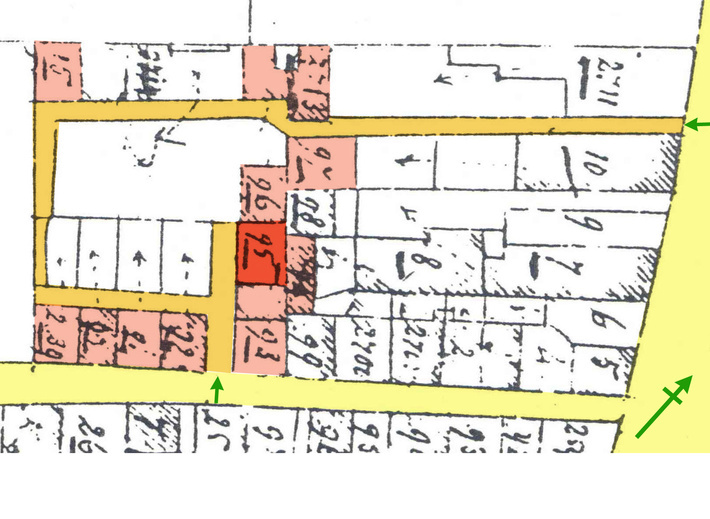 Rond 1832 omvatte het slop, van links onder tegen de klok in, de panden: