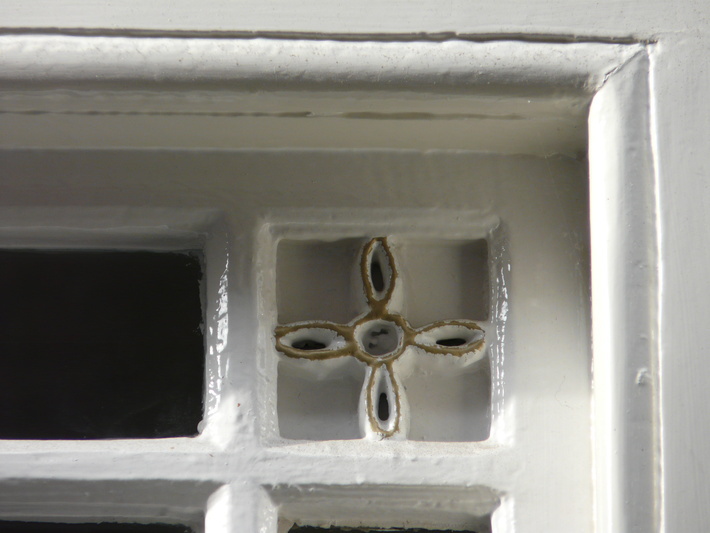 : bovenlicht, roedenpatroon met randmarge met kruisende roeden. Bloemmotief in een van de hoeken