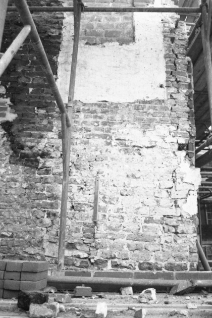 Springweg 6 tijdens de restauratie van de achtergevel (van het voorste achterhuis). De rechter hoek (van achter gezien). Links beroete steen van het rookkanaal van het (nu gesloopte) 2e achterhuis.