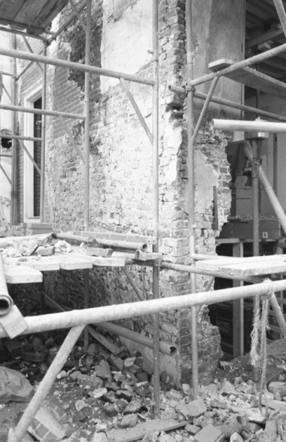 Springweg 6 tijdens de restauratie. Links de achtergevel (van het voorste achterhuis). Rechts de grotendeels verwijderde zijgevel, waarin onderaan een vierlicht gereconstrueerd zal worden. De hoek bevat veel bouwsporen.