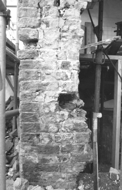 opmerkingen : Springweg 6 tijdens de restauratie. De hoek van de achtergevel (van het voorste achterhuis) en rechts de grotendeels verwijderde zijgevel. Er zijn veel bouwsporen te zien. De foto is gemaakt vanuit de tuin van Springweg 4