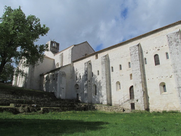 . Links de kerk met het koor en rechts ervan de noordertranseptarm en kloostervleugel.