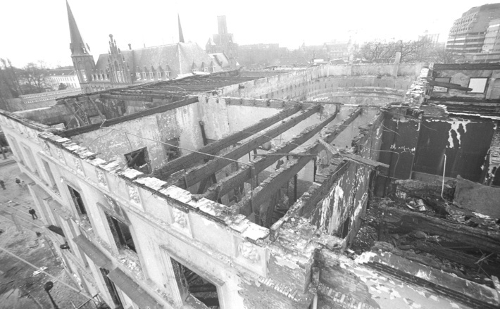 opmerkingen : Utrecht - Mariaplaats 27 na de brand vanuit een bak aan een hijskraan. Gezicht naar het zuidwesten met op de achtergrond Mariaplaats 27. Links de voorgevel, geheel rechts de rechterbeuk, daarna de middenbeuk met de voorhal en de grote zaal, achteraan de linker beuk