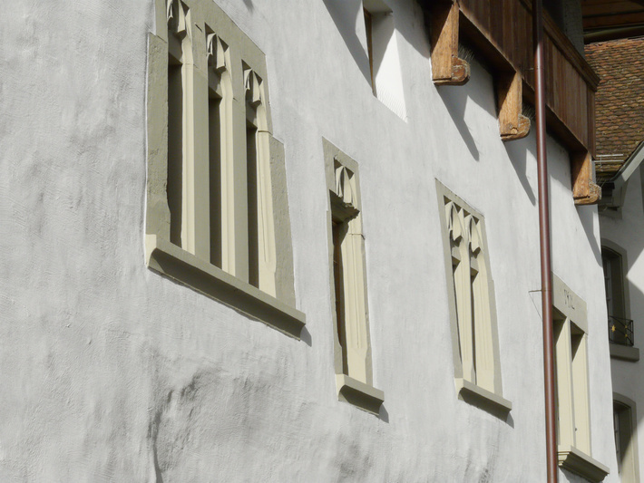 Thun (CH) - Rathausplatz - Velschenhaus, gotische vensters en rechts venster uit 1512