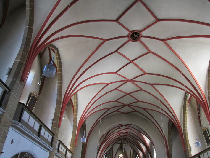 opmerkingen : Schwandorf (D) - kath. Pfarrkirche St. Jakob, interieur naar het oosten. Het gewelf uit 1678 vervangt een houten plafond en is in de periode 1868-1872 van stucwerkribben voorzien. Het schip, een 'Wandpfeilersaal', met kapellen tussen de inwendige steunberen, is bij die verbouwing van 'Empore' voorzien.