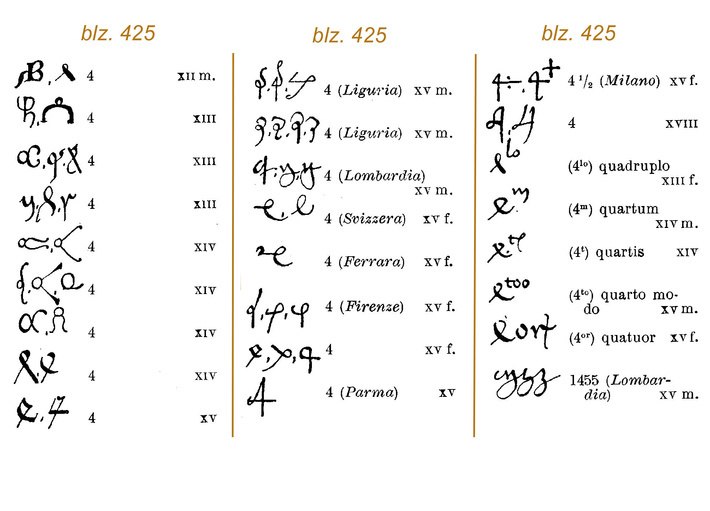 Opmerkingen: Gepubliceerd in: Cappelli, Adriano, Lexicon Abbreviaturarum Dizionario de abbreviature latine ed italiane. Modena, 1929 3e druk. [606 blz. ISBN -]. (reprint 2011: Milano (Ulrico Hoepli), ISBN 9788820345464). Hierin uit "Numerazione arabica" het cijfer 4: blz. 425