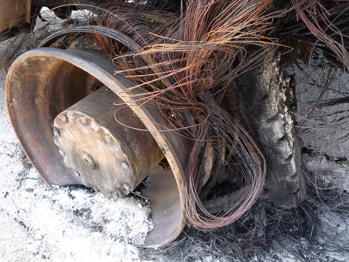 Autoband van uitgebrande vrachtwagen, langs de weg in Griekenland (tussen Eleusína en Corinthe)