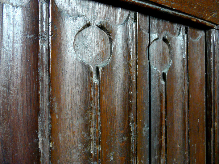 . Ingang, links in het koor, uit 1504, met in de deur gotische briefpanelen
