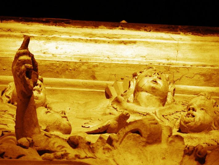 bij nacht, het beeld boven de ingang, van onder gezien.
