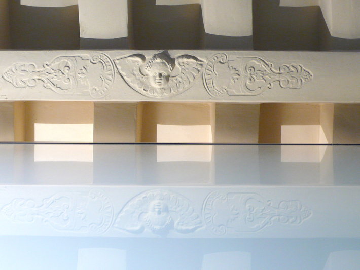 , stempelstucwerk in leemstucplafond, 1562 (na restauratie). Kopje, weerspiegeld in de glazen scheidingswand naar de later ingebrachte gang