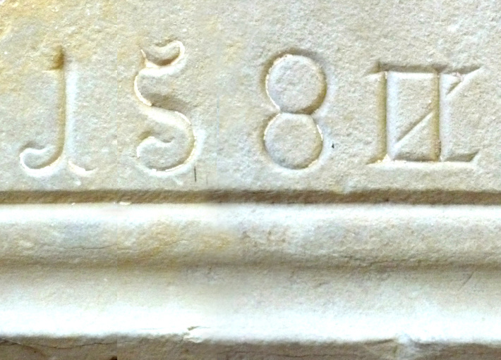 Fotomontage van het jaartal 1582, gewijzigd in 1580. De 2, geschreven als 'Z', past goed in het beeld. De verticale strepen erdoorheen zijn dieper getrokken en vormen een niet goed passende rechthoekige '0'. Aangenomen moet worden dat de ongewenste delen weggepleisterd waren.