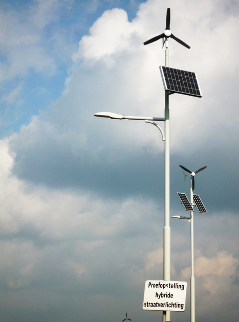 , proefopstelling zonnepaneel en windmolentje. De lantaarnpalen staan in Ede, op een brug over de Rijksweg A 30