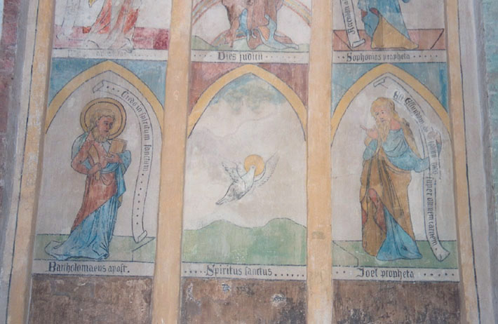 Ratzeburg (D) - Dom St. Maria und St. Johannes Ev.: kloostergang, muurschildering, eind 14e eeuw, restauratie 1899 (en later). In het midden de Heilige Geest
