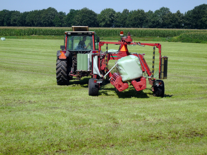 De hooibalen worden door een andere machine in heel veel plastic gewikkeld (bij Someren-Eind)