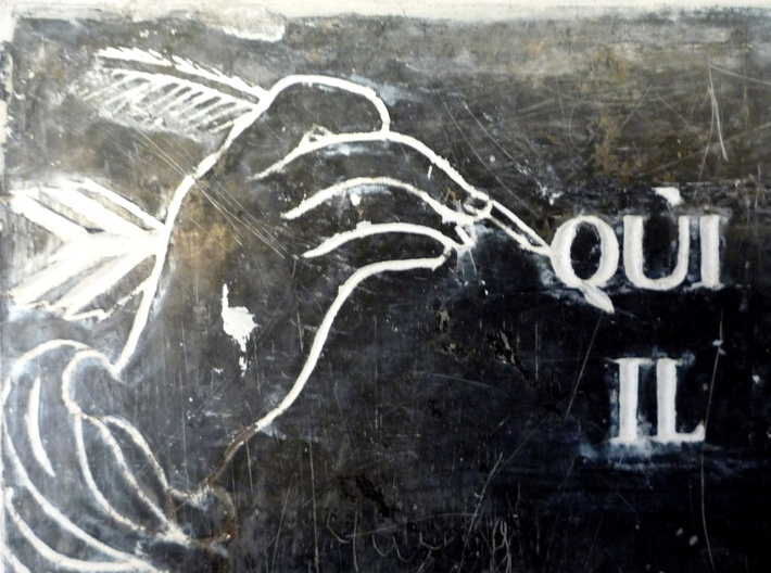 Mandello del Lario (I) - Piazza Italia 8, hoogwatersteen uit 1829. De met een ganzenveer schrijvende hand geeft het toenmalige hoogwaterpeil aan.
