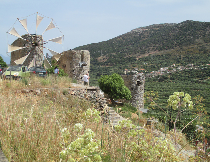Molens voor vaste windrichting in de bergen ten westen van Hagios Nikolaos (Kreta, GR).