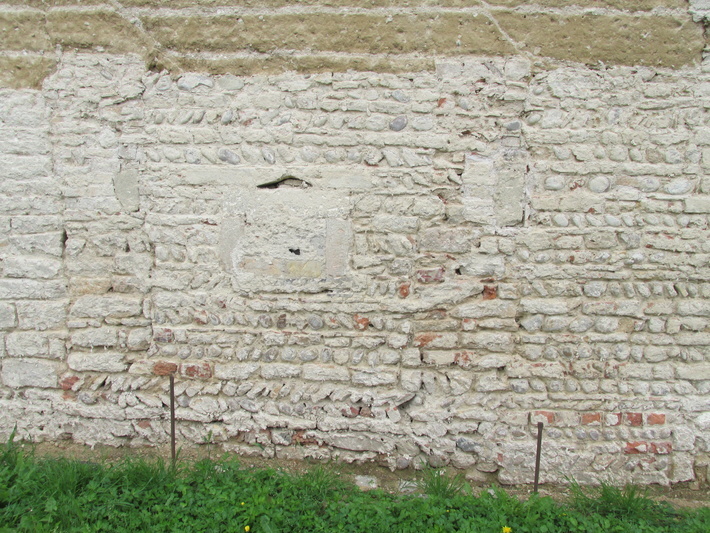 Het natuursteenmetselwerk is links opgetrokken uit grote blokken, rechts ervan met lagen platte steen, alternerend met keien, schuin geplaatst als stroomlagen.