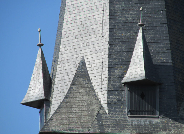 , achtkante torenspits met hoekaankappingen en aan vier zijden een dakkapel met spits