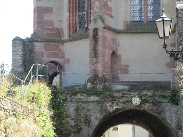 , met onderdoorgang, gezien vanuit het noorden. Links de stadsmuur, waarvan de weergang door de steunberen heen loopt.