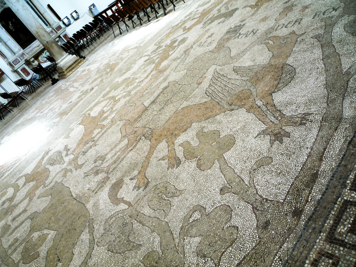 , mozaïekvloer (1163-1165), middenschip, 3e rij vanuit westen met rechts Alexander de Grotes luchtreis