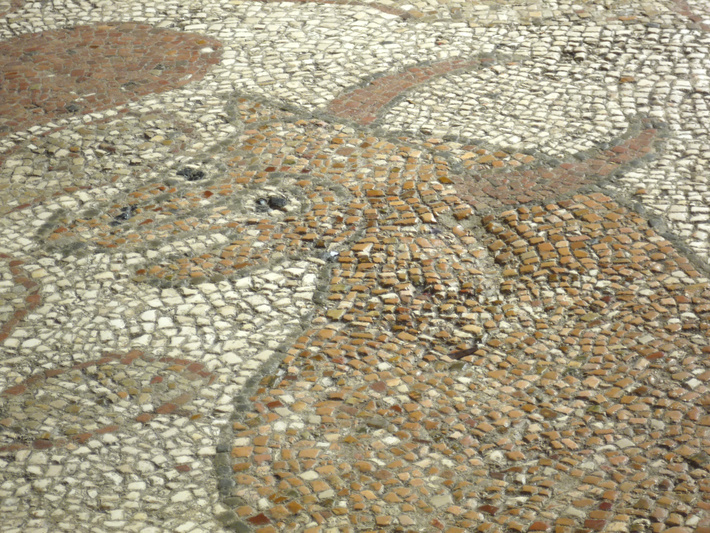 , mozaïekvloer (1163-1165), linker zijbeuk, het begin van het mozaïek uit het westen. Detail van het dier dat de levensboom draagt