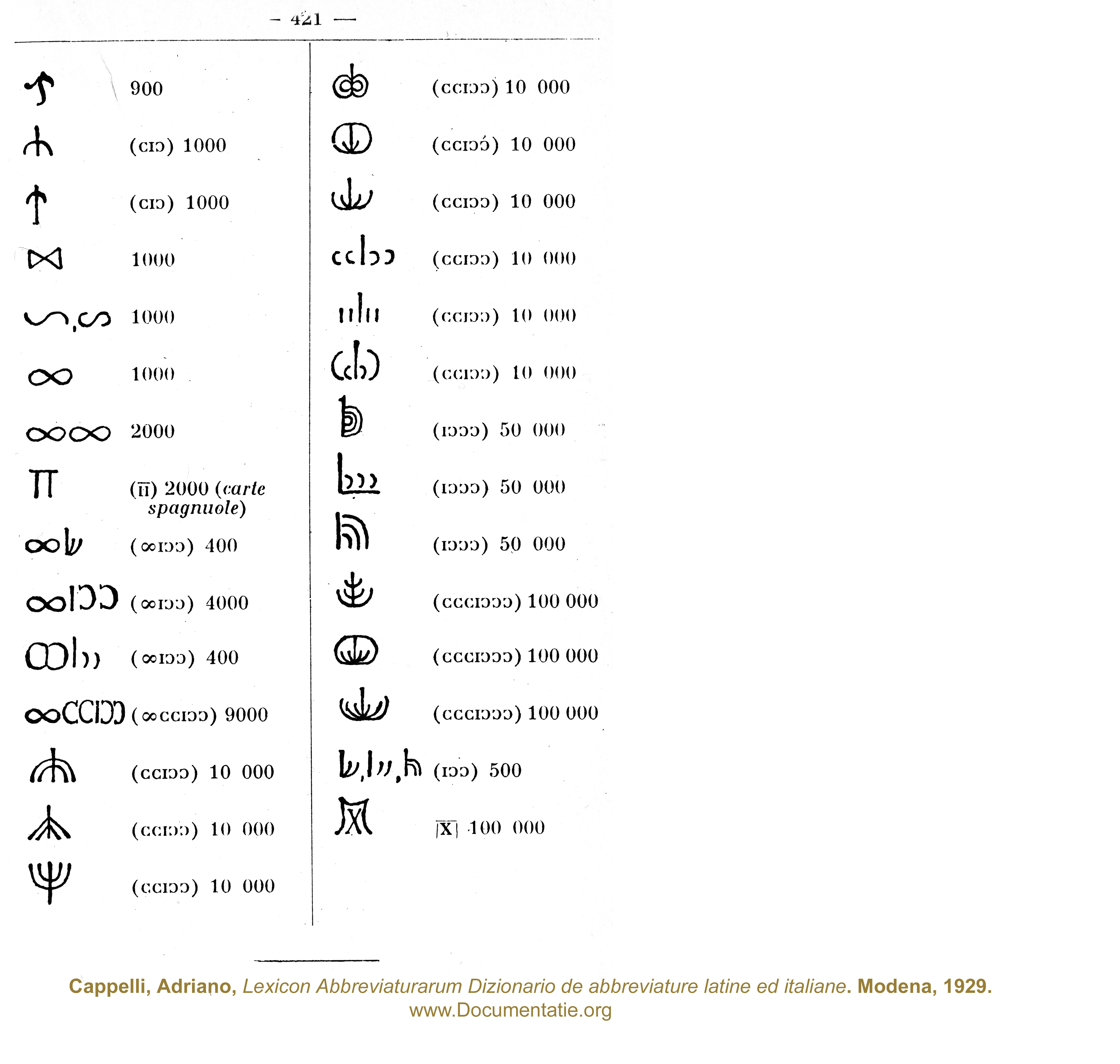 Omschrijving: Cappelli, Adriano, Lexicon Abbreviaturarum Dizionario de abbreviature latine ed italiane. Modena, 1929 3e druk. [606 blz. ISBN -]. (reprint 1973: Milano (Ulrico Hoepli), ISBN 9788820345464), "Numerazione Romana" blz. 421. (uit "Numerazione Romana")
