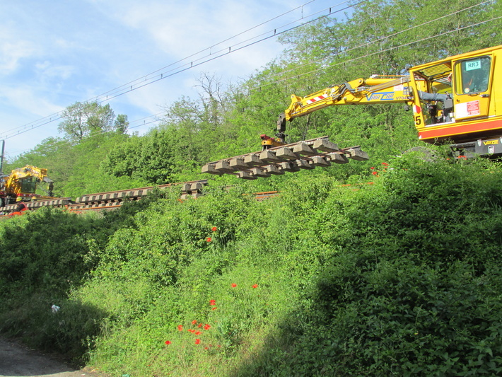 Spoorvervanging bij Limony (F). De rails zijn al op de betonnen dwarsliggers gemonteerd.