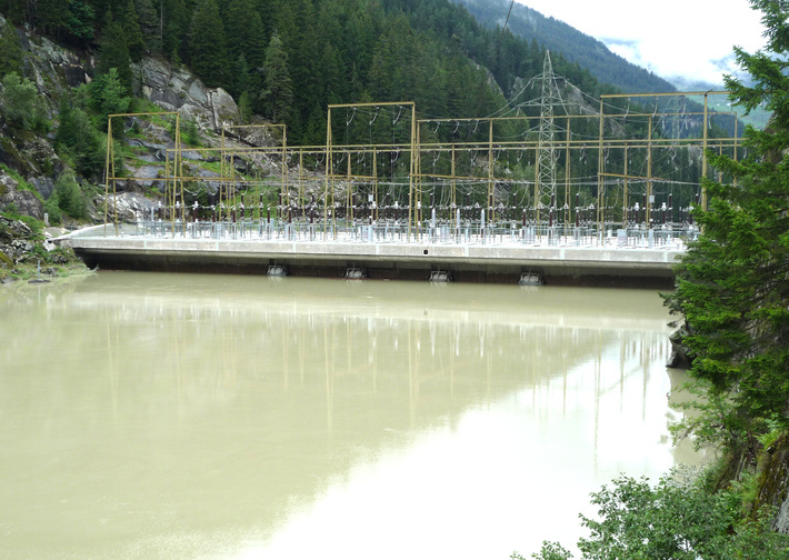 Andeer (CH), stuwdam in de Roffla-Schlucht, met de elektriciteitscentrale op de dam