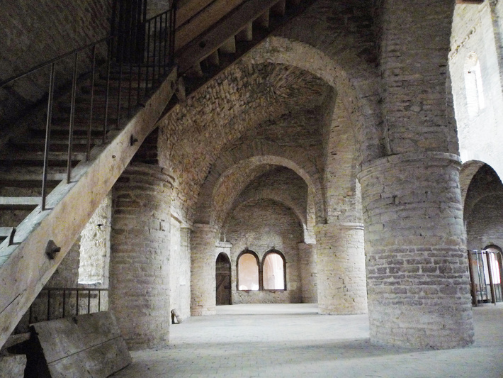 : Chapelle Saint-Philibert boven de narthex, noorderzijbeuk met halve tongewelven, naar het oosten gezien