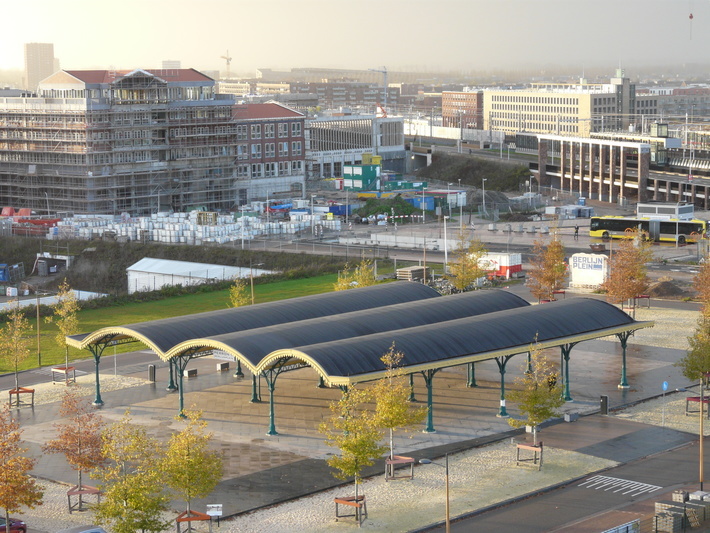 : gezicht vanaf de CineMec-bioscoop naar het noordwesten: het centrum van Leidsche Rijn in aanbouw. Op de voorgrond het