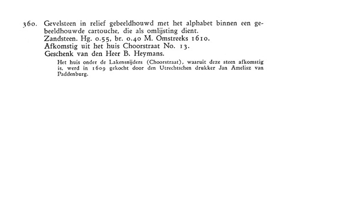 Opmerkingen: De beschrijving wekt verwarring: de schenker is in 1909, het vermoedelijke jaar van de verwijdering uit de gevel, eigenaar van zowel Choorstraat 13 (het hoofdadres) als van het dan onder hetzelfde adres vallende pand aan de Steenweg. De omschrijving "het huis onder de Lakensnijders" is juist, de toevoeging "Choorstraat" niet. Dat is de 'Lakensnijdersstraat', terwijl 'Onder de Lakensnijders' slaat op het 'gerecht Onder de Lakensnijders'. Deze aanduidingen worden vaak verward. Beide panden bevonden zich in het genoemde gerechtsgebied, dus daaruit valt de locatie van de steen niet af te leiden. In een eerdere catalogus van de museumcollectie, uit 1904 komt deze steen nog niet voor: Muller Fz., S., Catalogus van het Museum van Oudheden. Utrecht, 1904. Op de verbouwingstekeningen van 1872 en 1909 is te zien dat de steen zich in 1872 aan de Steenweg bevond en in het bouwplan van 1909 niet meer voorkwam.