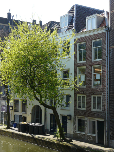 Utrecht - Lijnmarkt 24, de witte gevel, recht achter de stam van de boom, is de achtergevel