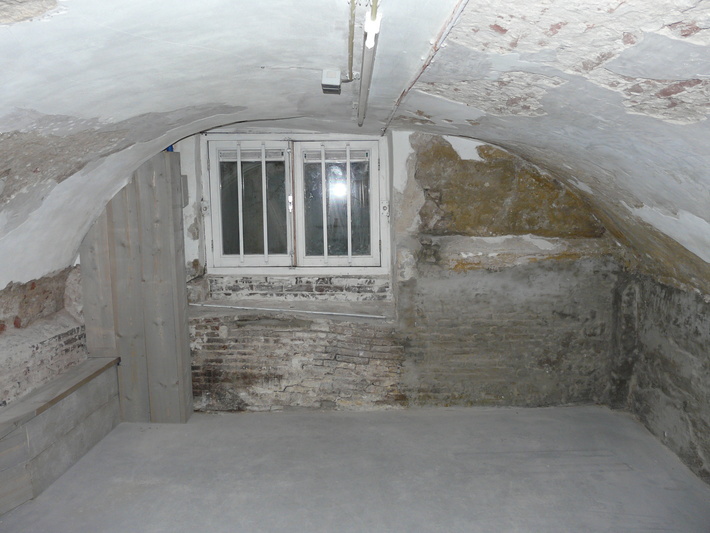 , noordoostelijke kelder naar het oosten gezien. Het kelderlicht komt uit bij de toegang vanuit de Donkerstraat.