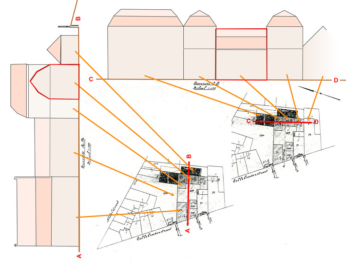 Detail: de panden, gezien vanaf twee doorsneden over het slop, bewerking door UDS, jp-1019
