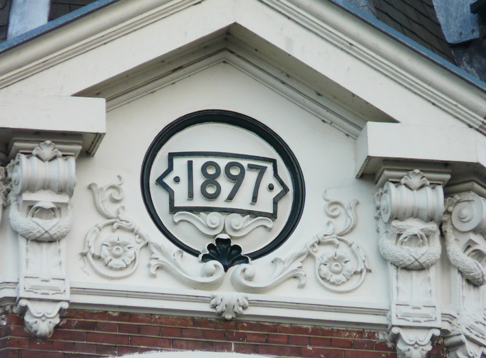 , stichtingsjaartal bovenin overhoekse vensteras