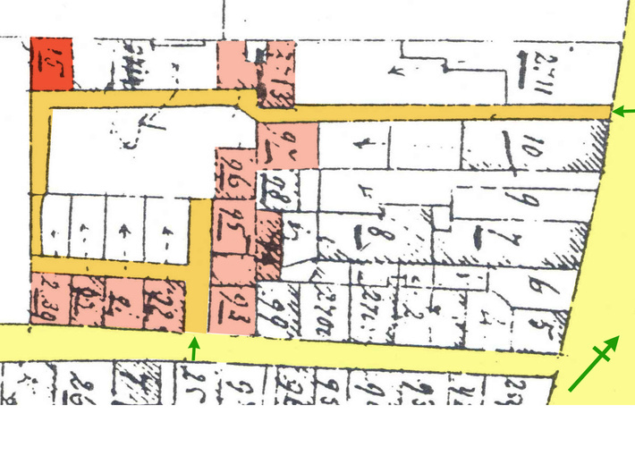 Rond 1832 omvatte het slop, van links onder tegen de klok in, de panden: