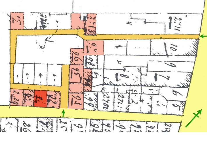 Rond 1832 omvatte het slop, van links onder tegen de klok in, de panden:
