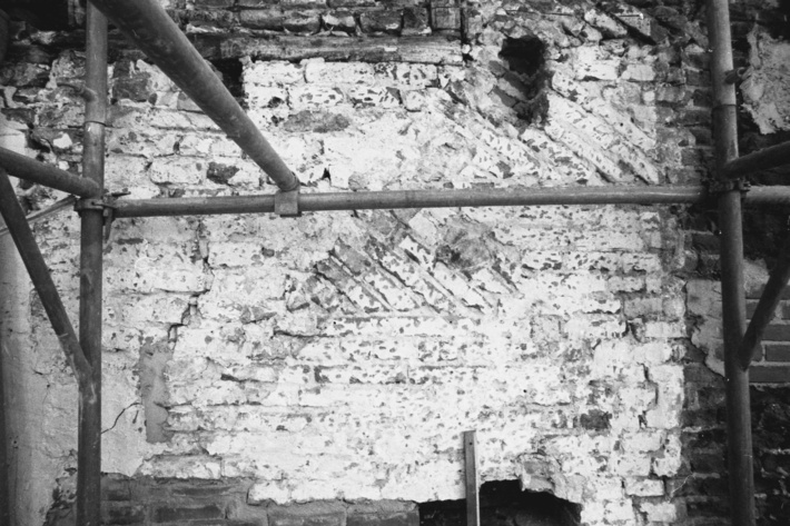 Springweg 6 tijdens de restauratie van de achtergevel (van het voorste achterhuis). Te zien zijn de vlechtingen van de lagere fase van deze gevel, met linksboven de onderdorpel van het kozijn dat aangetroffen is in de latere verhoging
