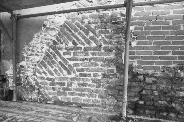 opmerkingen : Springweg 6 tijdens de restauratie van de achtergevel (van het voorste achterhuis). Te zien zijn de vlechtingen van de lagere fase van deze gevel en het metselwerk van de verhoging. Rechts beroete steen van het rookkanaal van het (nu gesloopte) 2e achterhuis. Erboven vers metselwerk van herstelling.