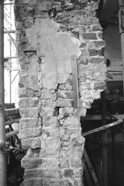 opmerkingen : Springweg 6 tijdens de restauratie. De hoek van de achtergevel (van het voorste achterhuis) en rechts de grotendeels verwijderde zijgevel. Er zijn veel bouwsporen te zien. De foto is gemaakt vanuit de tuin van Springweg 4