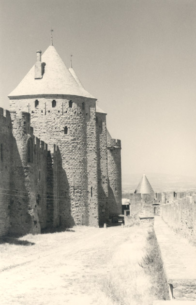 opmerkingen : Carcassonne (F) - Cité - stadsmuur (binnenste): v.l.n.r. Tour du Sacraire Saint-Sernin (toren nr 32), Tours Narbonnaisses (toren 1 en 2) waartussen de poort, Tour de Trésau (toren nr 3); buitenste stadsmuur, voor, Barbacane Saint- Louis en achter Tour de Bérard (toren nr 43 en 44)
