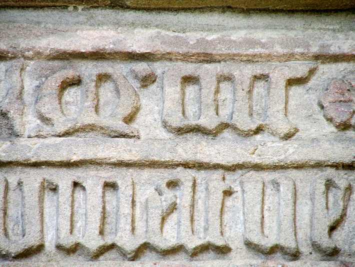 , detail inscriptie met in Romeinse cijfers van het jaartal 1477: 'LXXVII'